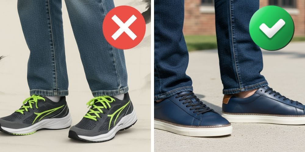 The Fix: Swap the foam soles and neon mesh for something with structure. Clean leather, suede sneakers, or retro sneakers instantly sharpen your look without trying too hard. Think “off-duty,” not “off course.”